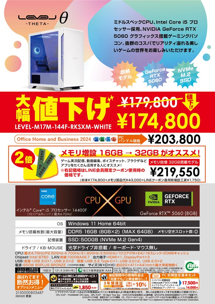 GeForce RTX 5060搭載! ゲーミングパソコンLEVEL-M17M-144F-RKSXM-WHITE