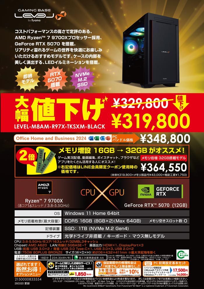 Ryzen™ 7 9700Xプロセッサー採用、GeForce RTX 5070搭載。当店人気のスペック!