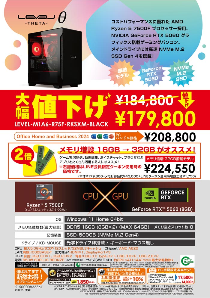 GeForce RTX 5060搭載! ゲーミングパソコンLEVEL-M1A6-R75F-RKSXM-BLACK