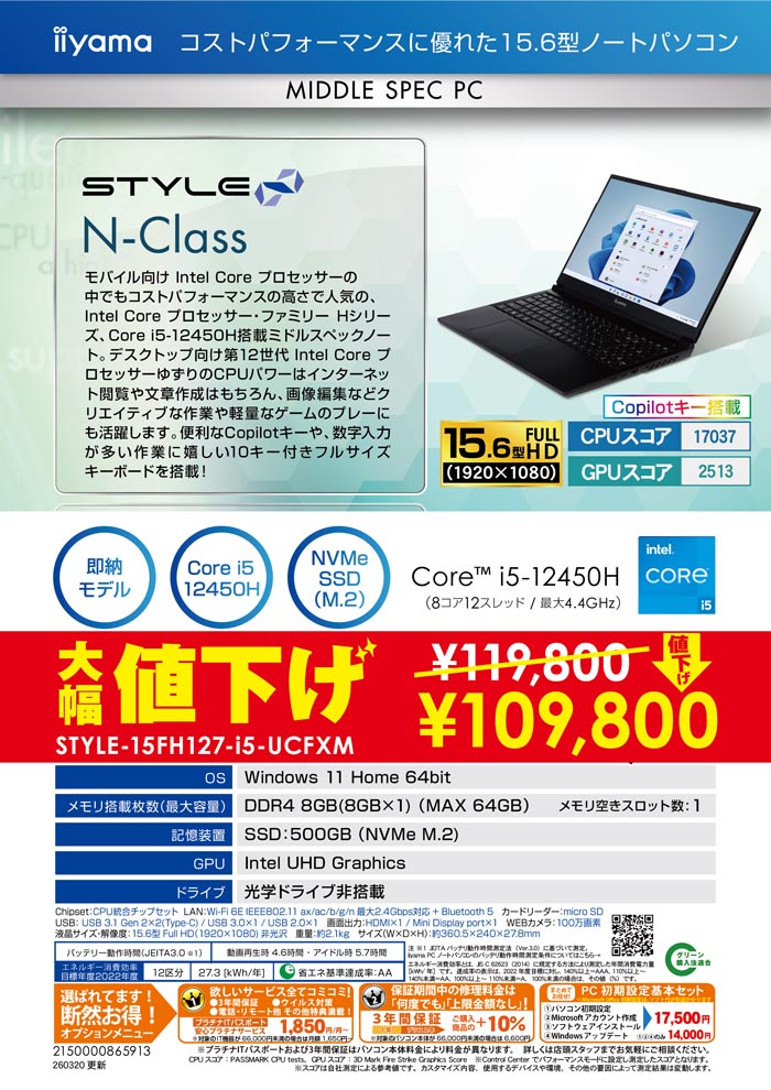 インテル Core i7プロセッサー搭載15.6型液晶ノートパソコンSTYLE-15FH127-i7-UCFXM