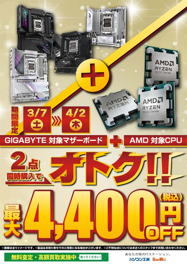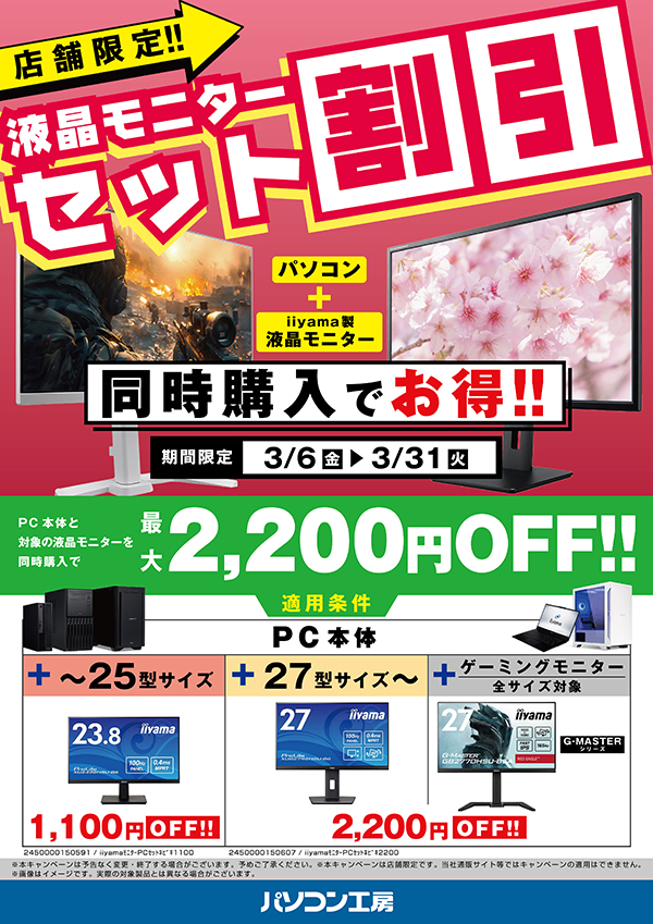 全国のパソコン工房・グッドウィル店舗にて、対象の新品 iiyama PCのご購入に応じて最大30,000円分相当の商品券またはポイントを還元する「決算ウルトラ還元祭」を開催中!