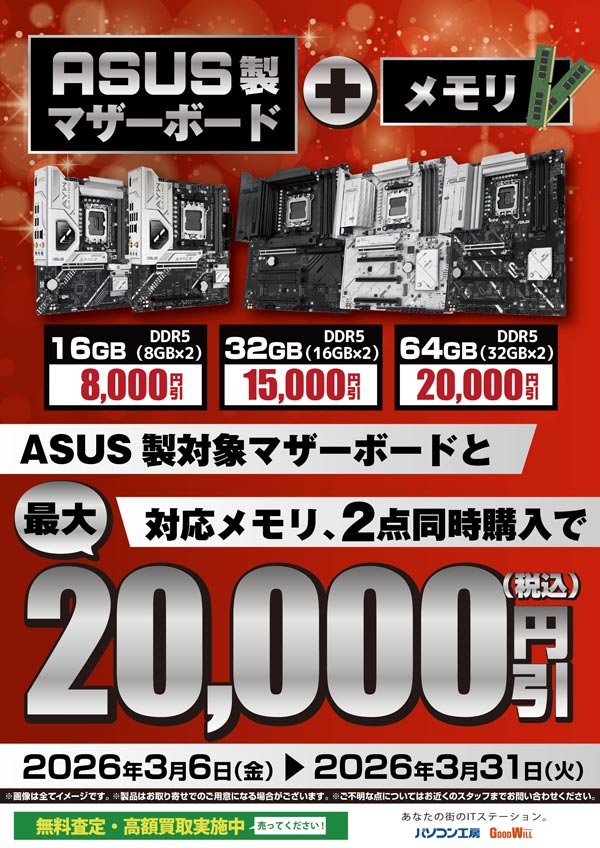 新品パソコン・中古パソコン及び、PCパーツ・周辺機器のご購入の際に当社指定の保証サービスの加入に応じて最大2万円分相当の商品券を還元いたします。
